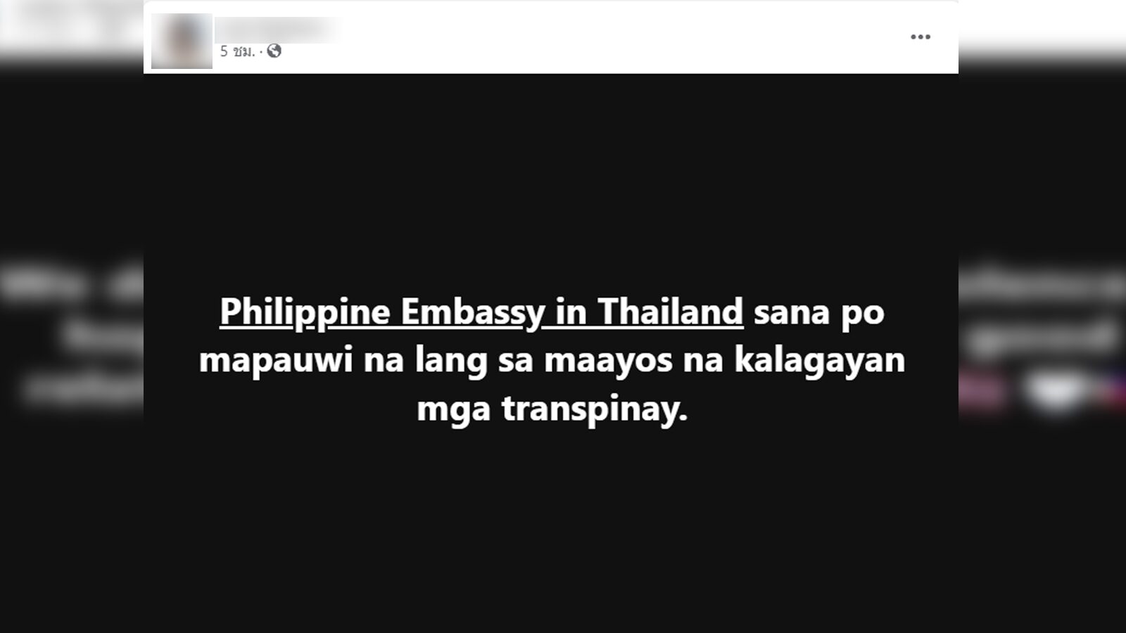 ล่าสุด มีผู้ใช้เฟซบุ๊กรายหนึ่งโพสต์คลิปว่า ขอความช่วยเหลือจากรัฐบาลฟิลิปปินส์และสถานทูตฟิลิปปินส์ในไทย เพราะเพื่อนชาวฟิลิปปินส์กำลังต้องการความช่วยเหลือจริง ๆ พวกเขากำลังมีปัญหาและถูกทำร้าย แม้กระทั่งผู้บริสุทธิ์ก็ได้รับผลกระทบ ต้องช่วยเหลือเพราะพวกเขาเหล่านั้นคือเพื่อนร่วมชาติของเรา