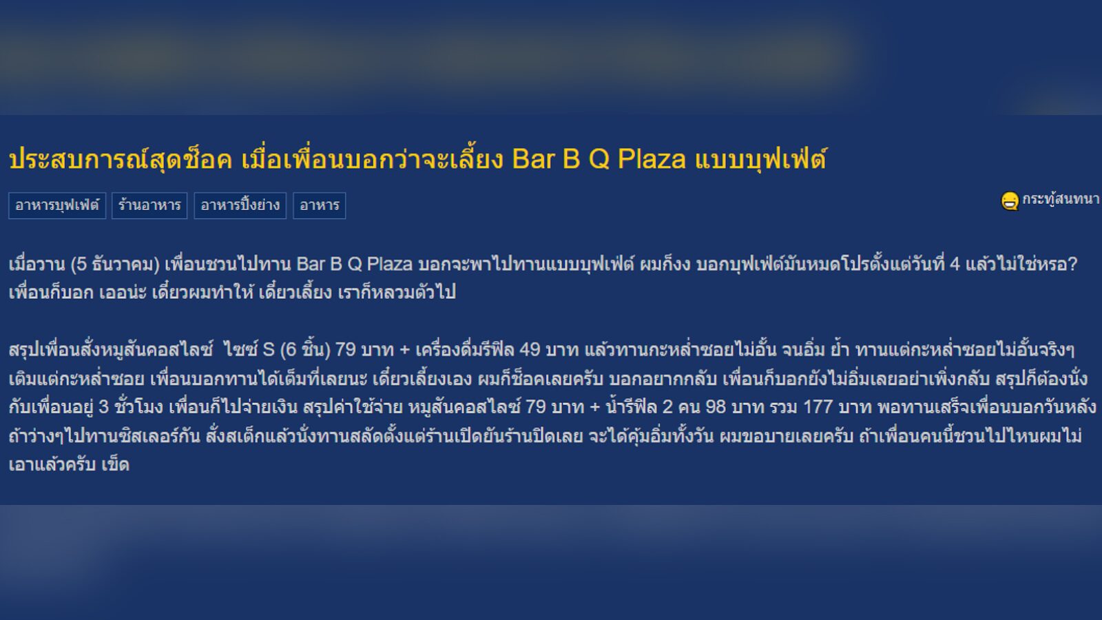เมื่อวันที่ 6 ธ.ค. 65 สมาชิกพันทิปหมายเลข1049607 ได้ตั้งกระทู้เล่าประสบการณ์การกินบุฟเฟต์สุดช็อก โดยเล่าว่า เพื่อนชวนไปทาน Bar B Q Plaza แบบบุฟเฟ่ต์ ซึ่งตอนแรกเขาสงสัยว่าโปรฯไม่ได้หมดไปตั้งแต่วันที่ 4 ธ.ค. แล้วหรือ? แต่เพื่อนยืนยันว่าจะเลี้ยง เขาจึงหลวมตัวไป