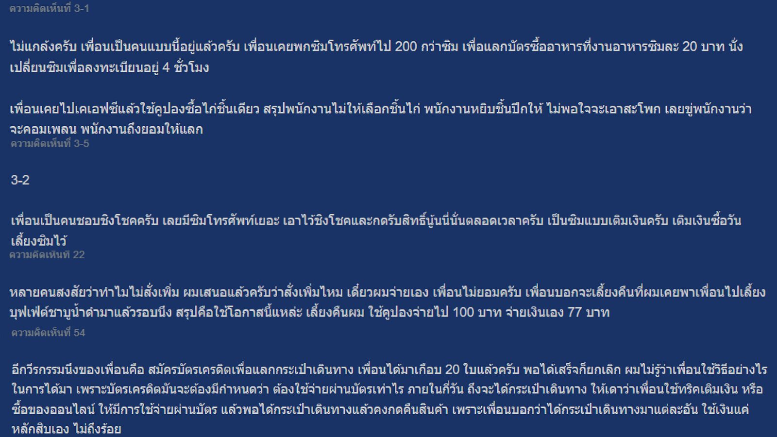 พร้อมกล่าวว่าเพื่อนเป็นคนแบบนี้อยู่แล้ว เคยพกซิมกว่า 200 ซิมเพื่อไปแลกบัตรซื้ออาหาร ซิมละ 20 บาท นั่งเปลี่ยนซิมลงทะเบียนอยู่ 4 ชั่วโมง แถมเคยสั่งไก่ทอดร้านดังแล้วใช้คูปองซื้อไก่ชิ้นเดียว พนักงานไม่ให้เลือกชิ้นไก่แล้วหยิบชิ้นปีกให้ แต่เพื่อนไม่พอใจจะเอาสะโพก เลยขู่พนักงานว่าจะคอมเพลน พนักงานถึงยอมให้แลก