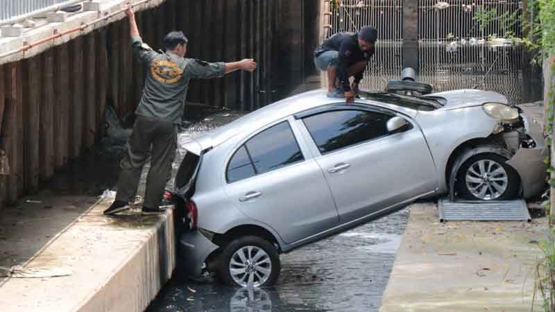 ระทึก สาวขับเก๋งพุ่งเสยรั้วกั้น ตกลงไปในคูน้ำย่านดอนเมือง ชาวบ้าน-กู้ภัย เข้าช่วย