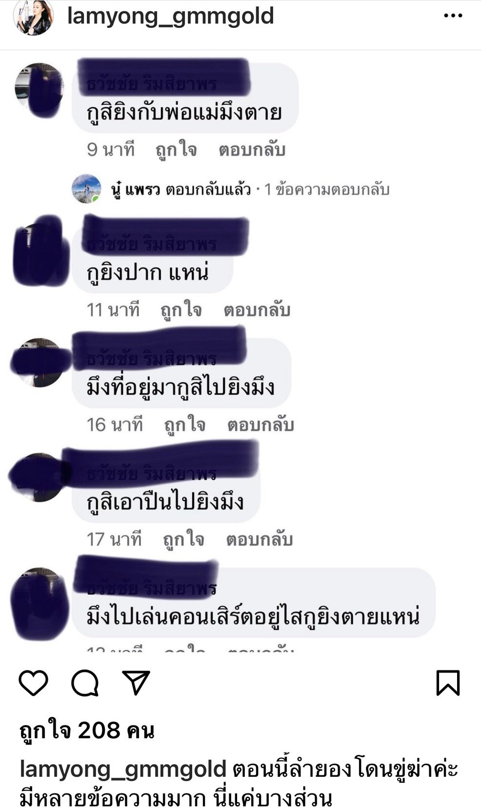 เราได้แจ้งทางค่ายไหม? “ทางค่ายบอกให้รีบไปแจ้งความ ตอนนี้กำลังให้ลูกน้องปริ้นเอกสาร ข้อมูลที่เขาด่าเราหลายๆครั้ง”