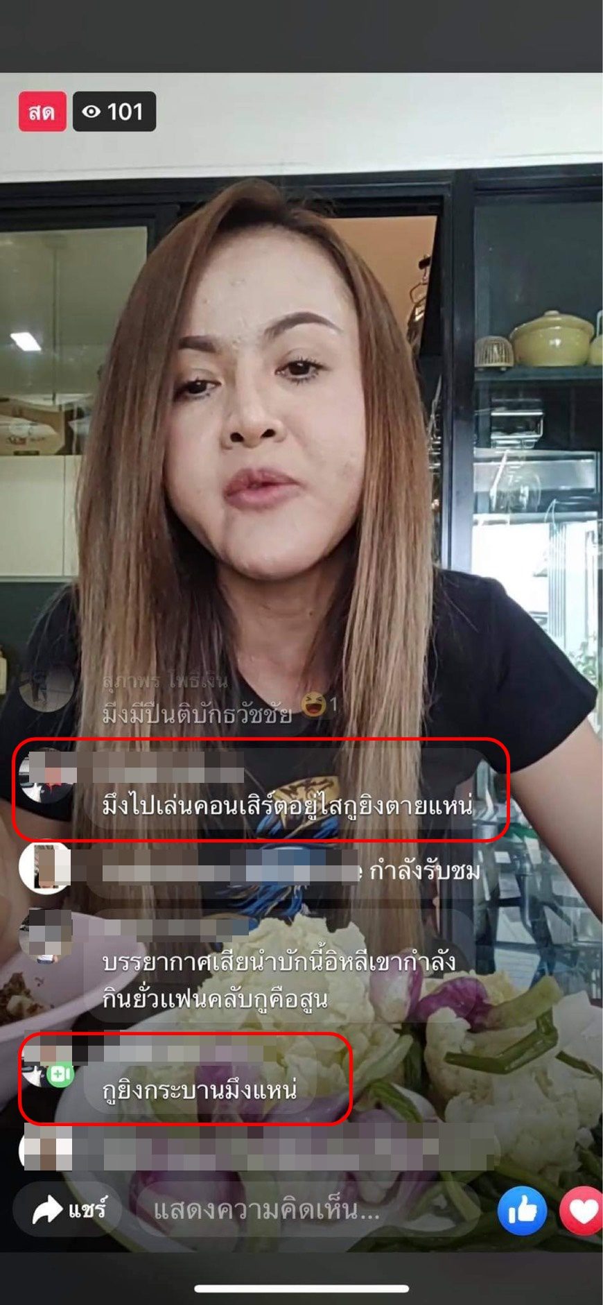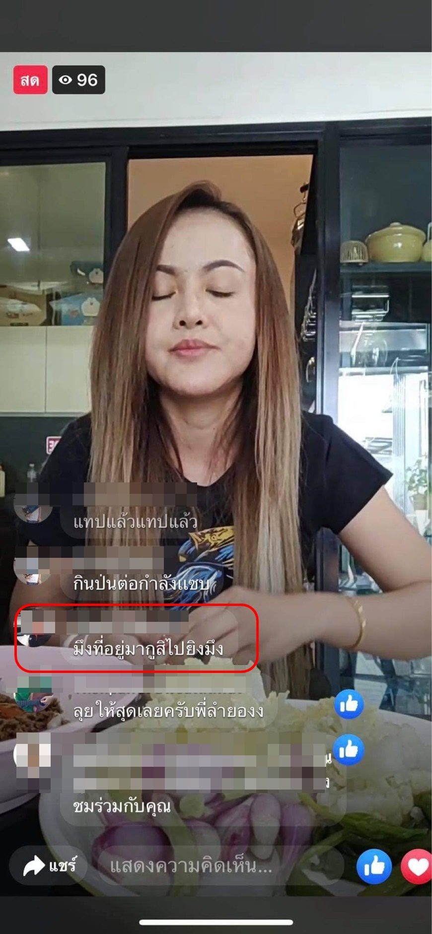 เคยเข้ามาตอบคอมเมนต์ของเขาไหม?“มีแฟนคลับของเราที่เข้าไปว่าเขา เวลาที่เราไลฟ์สด เขาเข้ามาด่า แฟนคลับเราก็บอกว่าอย่ามาด่า ออกไปๆ ตัวเราเองก็พูดในไลฟ์สดให้เขาออกไปอย่ามาก่อกวน ยิ่งพูดชื่อเขา เขาก็ยิ่งด่าหยาบๆ เป็นอยู่แบบนี้ หรือบางครั้งเราไม่พูดชื่อเขา เขาก็จะเข้ามาคอมเมนต์รัวๆ ในเมนต์ก็จะมีแต่ชื่อเขา”