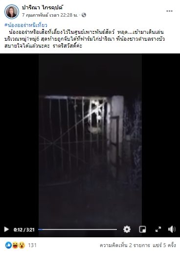 โดย น.ส.ปารีณา โพสต์คลิปเหตุการณ์ความยาวประมาณ 3 นาทีเศษ พร้อมระบุข้อความว่า #น้องออร่าหนีเที่ยว น้องออร่าหรือเสือที่เลี้ยงไว้ในศูนย์เพาะพันธุ์สัตว์ หลุดเข้ามาเดินเล่นบริเวณ หมู่1 และหมู่6 สุดท้ายถูกจับได้ที่ฟาร์มไก่ปารีณา พี่น้องชาวตำบลรางบัว สบายใจได้แล้วนะคะ ราตรีสวัสดิ์ค่ะ