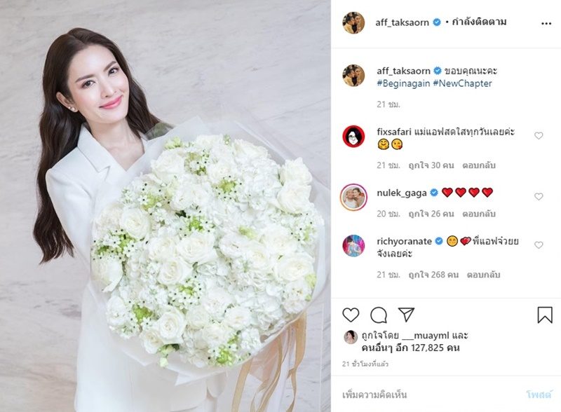 มีเหล่าบรรดาแฟนๆ แห่ลุ้นกับแคปชั่น Begin again + New Chapter ของสาวแอฟด้วยจำนวนมาก แห่สงสัยมีหนุ่มๆที่ไหนส่งดอกไม้มาให้สาวแอฟกันแน่ ต้องรอเจ้าตัวชี้แจงสถานะหัวใจล่าสุดกันแล้ว