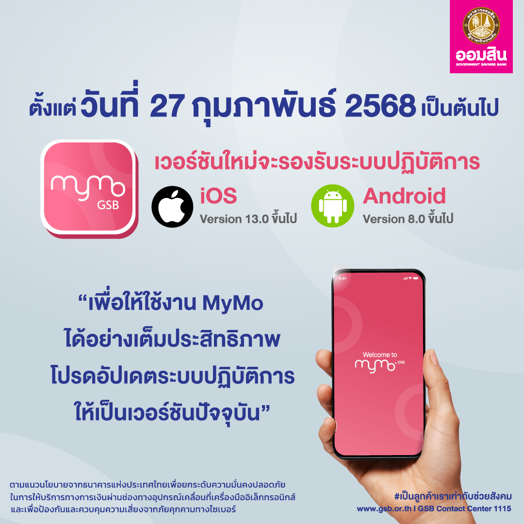 ผู้สื่อข่าวรายงานว่า ธนาคารออมสิน ประชาสัมพันธ์ประชาชนผ่านช่องทางโซเชียลมีเดีย ระบุว่า ตั้งแต่ วันที่ 27 กุมภาพันธ์ 2568 เป็นต้นไป MyMo เวอร์ชันใหม่จะรองรับระบบปฏิบัติการดังนี้