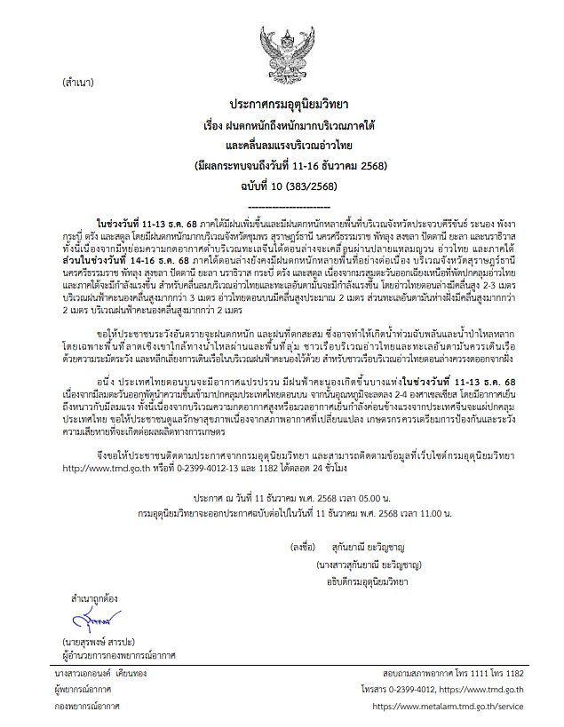 วันที่ 11 ธ.ค.2568 กรมอุตุนิยมวิทยา ประกาศ เรื่อง ฝนตกหนักถึงหนักมากบริเวณภาคใต้ และคลื่นลมแรงบริเวณอ่าวไทย (มีผลกระทบจนถึงวันที่ 11-16 ธันวาคม 2568) ฉบับที่ 10 (383/2568) ระบุว่า