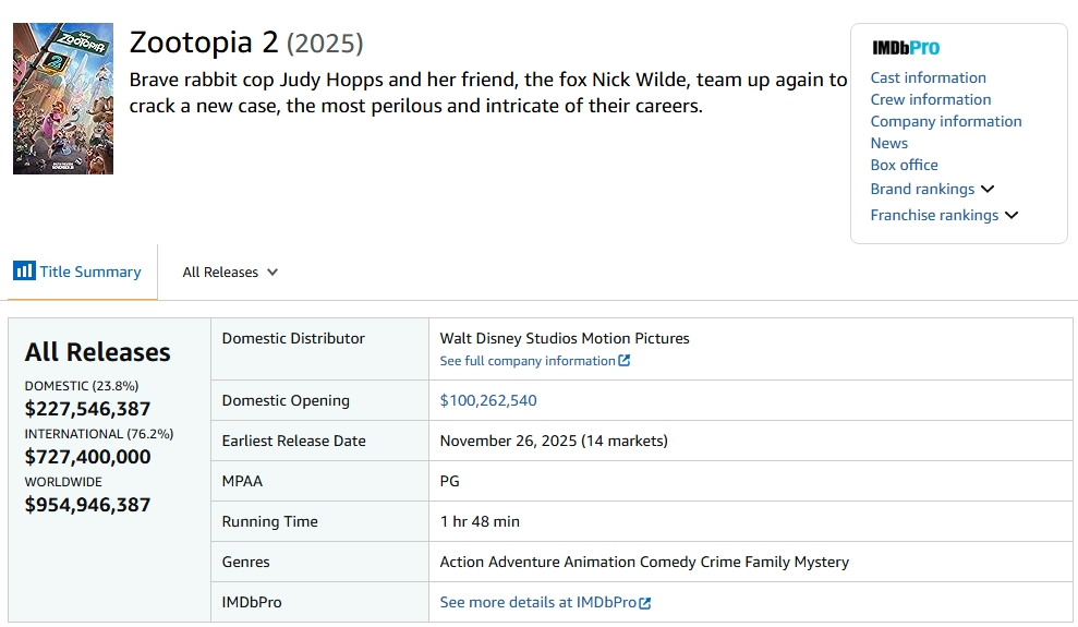 สำหรับรายได้ Box Office ของ Zootopia 2 ในปัจจุบัน (ข้อมูลสืบค้น ณ วันที่ 11 ธันวาคม 2025) เป็นดังนี้
