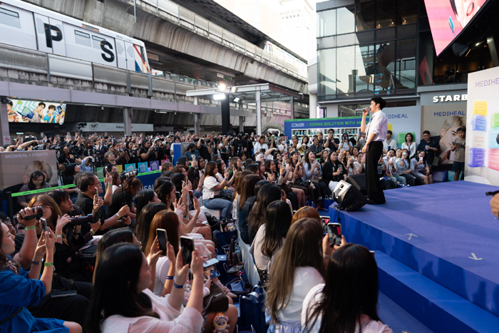 บรรยากาศภายในงาน ‘Pop-up: MEDIHEAL DERMA SHOP’ จัดเต็มท่ามกลางสื่อมวลชน ชาวสยามแฟนคลับล้นทะลัก เพราะ MEDIHEAL ขนไอเทมดูแลผิวตัวท็อปมาแบบครบเซต โดยเฉพาะ Toner Pad โทนเนอร์แพดอันดับ 1 จากเกาหลีใต้ที่หลายคนยกให้เป็นจุดเริ่มต้นของผิวดี ช่วยดูแลได้ครอบคลุมหลายปัญหาผิว และเข้าสู่ช่วงไฮไลต์เมื่อ ‘โฟร์ท ณัฐวรรธน์’ แบรนด์แอมบาสเดอร์ MEDIHEAL Toner Pad ปรากฏตัวบนเวทีด้วยลุคหนุ่มออฟฟิตที่จริงใจออร่าจับ งานผิวสุขภาพดีจนเห็นแล้วเชื่อเลยว่าผิวดีมีอยู่จริง แถมยังขึ้นมาแชร์เคล็ดลับ ‘เดอร์มาโซลูชันเพื่อผิวสุขภาพดี’ แบบไม่มีกั๊กอีกด้วย และยิ่งทำให้แฟนๆ ใจละลายกว่าเดิมเพราะกิจกรรมพิเศษสุดเอ็กซ์คลูซีฟที่ได้ใกล้ชิด ‘โฟร์ท’ ทั้งเล่นเกมและถ่ายภาพร่วมกับผู้โชคดีบนเวที เรียกเสียงกรี๊ดดังสนั่นตลอดกิจกรรมเติมความพีกความฟินให้บรรยากาศในงานยิ่งขึ้นไปอีกขั้น
