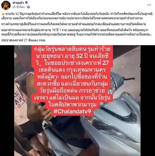 วันที่ 5 ม.ค.2569 จากกรณีเพจท่านเปา โพสต์คลิปเหตุการณ์ ชายวัย 52 ปี ถูกกลุ่มวัยรุ่นทำร้ายจนเสียชีวิต หลังจากขับรถไปเฉี่ยวชนกับวัยรุ่น ทำให้โทรศัพท์ของหนึ่งในคู่กรณีเสียหาย และเกิดการโต้เถียงกันก่อนจะเหตุการณ์บานปลายทางวัยรุ่นได้โทรตามพรรคพวกมารุมทำร้ายร่างกายจนบาดเจ็บสาหัส ก่อนเสียชีวิตในเวลาต่อมา เหตุเกิดที่ประชาสงเคราะห์ 27 ดินแดง กทม.