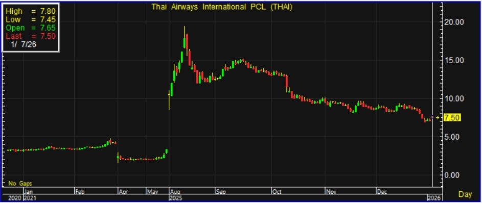 ผู้สื่อข่าวรายงานว่า วันนี้ (7 ม.ค.69) ราคาหุ้นบริษัท การบินไทย จำกัด (มหาชน)หรือ THAI ณ เวลา 10:09 น. อยู่ที่ระดับ 7.50 บาท บวก 0.45 บาท หรือ 6.38% สูงสุดที่ระดับ 7.50 บาท ต่ำสุดที่ระดับ 7.45 บาท ด้วยมูลค่าการซื้อขาย 163.44 ล้านบาท