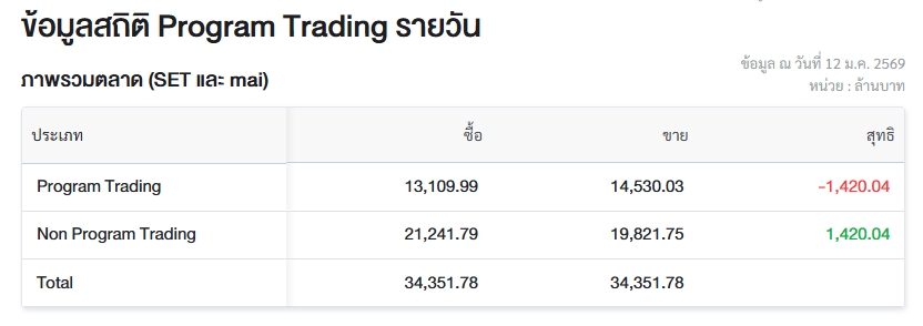 ขณะที่มูลค่าซื้อขายรายวันผ่าน Non Program Trading หรือ “การซื้อขายที่ไม่ใช่โปรแกรม” มีมูลค่าซื้อจำนวน 21,241.79 ล้านบาท และมูลค่าขายจำนวน 19,821.75 ล้านบาท เท่ากับซื้อสุทธิ 1,420.04 ล้านบาท