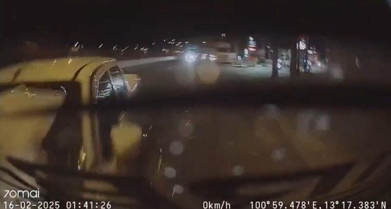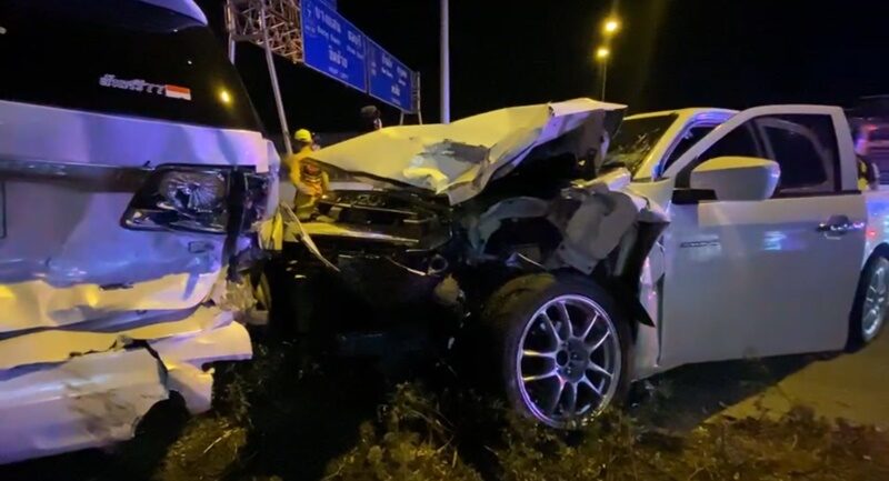 เจ้าหน้าที่กู้ภัยไตรคุณธรรมได้รับแจ้งมีเหตุรถชนกันหลายคันบนถนนคู่ขนานถนนมอเตอร์เวย์ช่วงหน้าปั๊มคาลเท็กซ์ ถนนสาย 7 ขาเข้า กทม. หมู่ 7 ต.หนองข้างคอก อ.เมือง จ.ชลบุรี มีคนเจ็บ จึงรุดไปตรวจสอบพบรถกระบะยี่ห้อฟอร์ด สีดำ ทะเบียน 3 ฒฮ 3433 กทม. สภาพด้านข้างมีรอยถูกเฉี่ยวชน