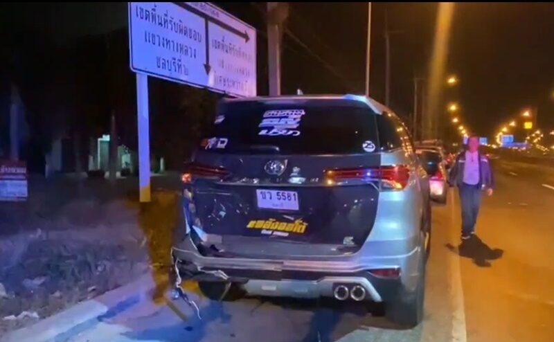 ห่างไปเล็กน้อย พบรถนั่งส่วนบุคคลยี่ห้อโตโยต้า ฟอร์จูนเนอร์ สีบรอนซ์เทา ทะเบียน ขว 5581 ชลบุรี มีรถกระบะยี่ห้ออีซูซุ ดีแม็กซ์ สีขาว ทะเบียน จก 8963 ชลบุรี ชนท้ายสภาพพังยับมีหญิงที่มากับรถกระบะได้รับบาดเจ็บ กู้ภัยฯปฐมพยาบาลเบื้องต้นนำส่ง รพ.ชลบุรี ใกล้กันพบรถนั่งส่วนบุคคลยี่ห้อโตโยต้า ฟอร์จูนเนอร์ สีขาว ทะเบียน กจ 5770 ฉะเชิงเทรา สภาพโดนชนเช่นกัน