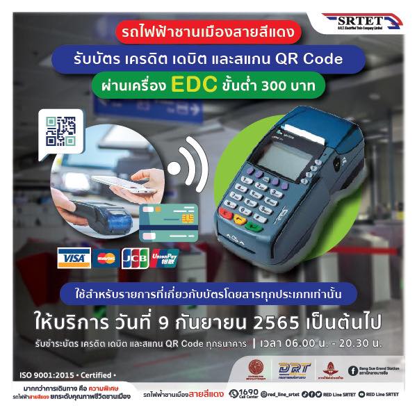 ก่อนหน้านี้ รถไฟฟ้าสายสีแดง เปิดให้บริการ รับบัตรเครดิต เดบิต และสแกน QR Code ผ่านเครื่อง EDC ทุกสถานี มาตั้งแต่วันที่ 9 กันยายน 2565 โดยมีเงื่อนไข คือ รับชำระบัตร เครดิต เดบิต และสแกน QR Code ทุกธนาคาร สำหรับรายการที่เกี่ยวกับบัตรโดยสารทุกประเภทขั้นต่ำ 300 บาท และสามารถจ่ายผ่านช่องทางดังกล่าวได้ตั้งแต่เวลา 06:00 น. ถึง 20:30 น.