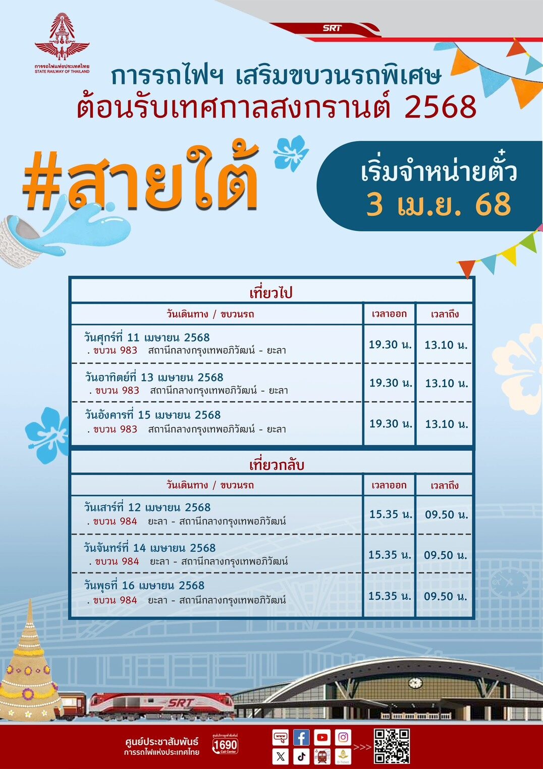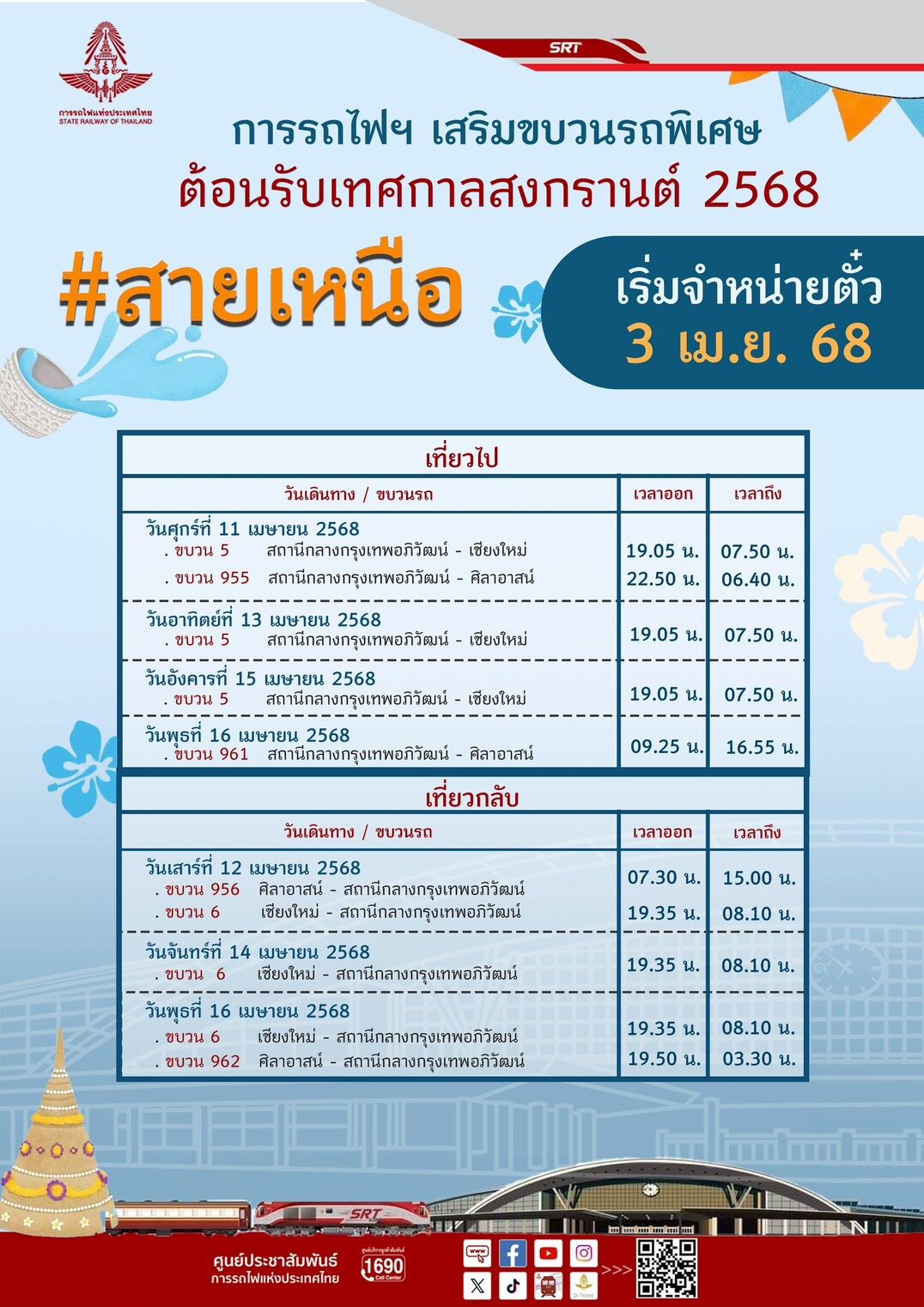 "รถไฟ" เพิ่มขบวนรถเสริมพิเศษ 26 เที่ยว รับสงกรานต์ 2568 เปิดขายตั๋ว 3 เม.ย. รองรับประชาชนไม่ต่ำกว่าแสนคน/วัน เดินกลับภูมิลำเนา-ท่องเที่ยว