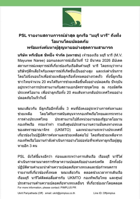 วันที่ 12 มี.ค.69 ภายหลังเกิดเหตุการณ์เรือมยุรีนารี ถูกโจมตีที่ช่องแคบฮอร์มุซ โดยลูกเรือ 20 คน ถูกช่วยเหลือขึ้นฝั่งประเทศโอมานได้อย่างปลอดภัย แต่ยังมีลูกเรืออีก 3 คนยังสูญหาย