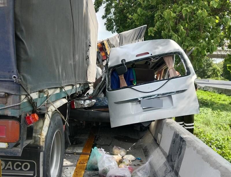 รถพ่วงเสียหลักเบียดทับ รถตู้ผู้แสวงบุญเจ็บเพียบ คนขับพ่วงเผยแหนบล้อหน้าหัก