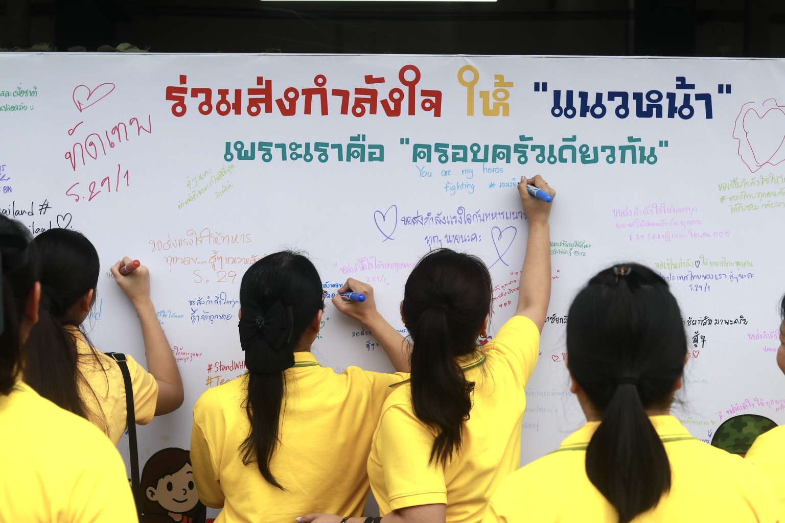 “ เพราะเราคือ ครอบครัวเดียวกัน แม่บ้าน ร.29 และครอบครัว พร้อมใจกันส่งกำลังใจให้พ่อบ้านที่ปฏิบัติภารกิจในแนวหน้า ให้สามารถปฏิบัติภารกิจปกป้องผืนแผ่นดินไทยได้อย่างเต็มขีดความสามารถ ”