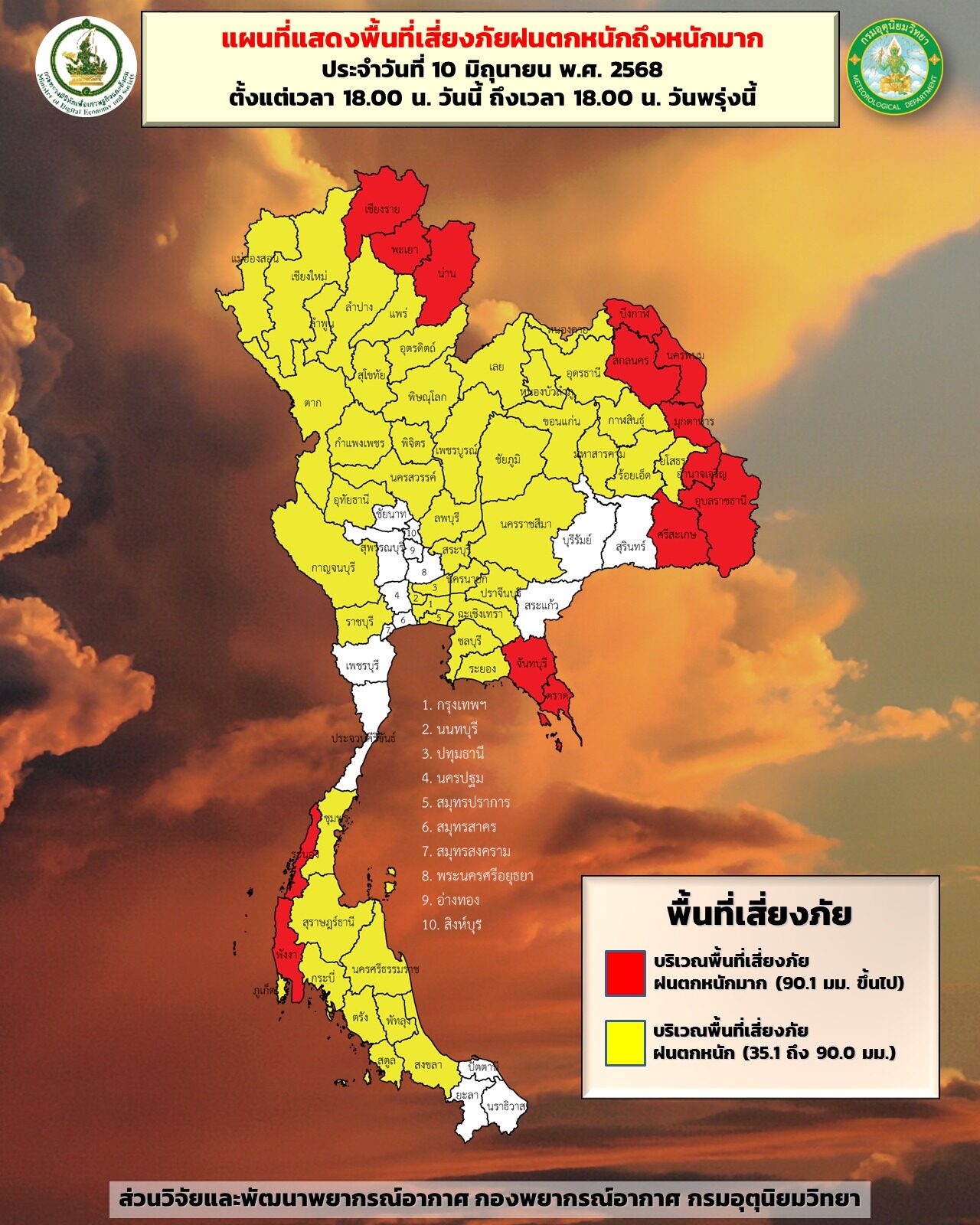 วันที่ 10 มิ.ย.2568 กรมอุตุนิยมวิทยา พยากรณ์อากาศ 24 ชั่วโมงข้างหน้า ประเทศไทยมีฝนฟ้าคะนองและมีฝนตกหนักบางแห่ง โดยมีฝนตกหนักมากบางพื้นที่บริเวณภาคเหนือ ภาคตะวันออกเฉียงเหนือ ภาคตะวันออก และภาคใต้ฝั่งตะวันตก ขอให้ประชาชนในบริเวณดังกล่าวระวังอันตรายจากฝนตกหนักถึงหนักมากและฝนที่ตกสะสม ซึ่งอาจทำให้เกิดน้ำท่วมฉับพลัน และน้ำป่าไหลหลาก โดยเฉพาะพื้นที่ลาดเชิงเขาใกล้ทางน้ำไหลผ่านและพื้นที่ลุ่ม