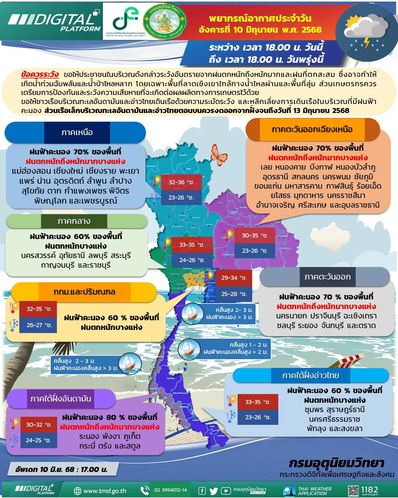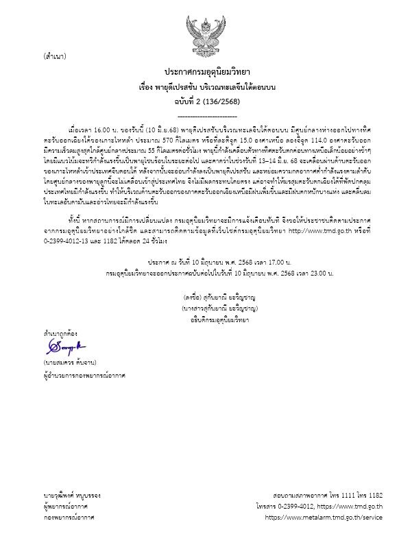 ฉบับที่ 2 ความว่า เมื่อเวลา 16.00 น. ของวันนี้ (10 มิ.ย.68) พายุดีเปรสชันบริเวณทะเลจีนใต้ตอนบน มีศูนย์กลางห่างออกไปทางทิศตะวันออกเฉียงใต้ของเกาะไหหลำ ประมาณ 570 กิโลเมตร หรือที่ละติจูด 15.0 องศาเหนือ ลองจิจูด 114.0 องศาตะวันออก มีความเร็วลมสูงสุดใกล้ศูนย์กลางประมาณ 55 กิโลเมตรต่อชั่วโมง