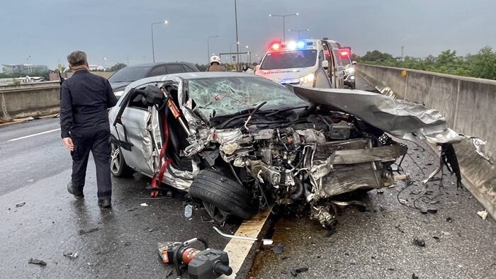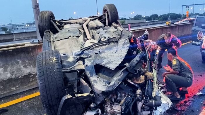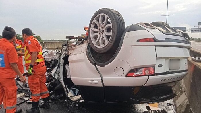 สาวขับแลนด์โรเวอร์ ย้อนศรขึ้นทางด่วน พุ่งชนเมอร์เซเดสเบนซ์ สนั่นทางด่วนฉลองรัช พังยับเยิน หงายท้องล้อชี้ฟ้า บาดเจ็บสาหัส ตำรวจเร่งเช็กวงจรปิด