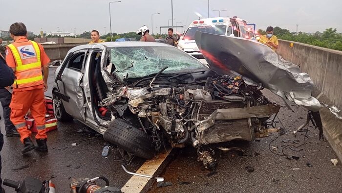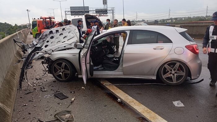 ที่เกิดเหตุเป็นถนน 3 เลน ในช่องทางซ้ายสุด พบรถยนต์ ยี่ห้อเมอร์เซเดส-เบนซ์ A250 สีเทา ทะเบียน กทม. สภาพหน้ารถพังยับเยิน คนขับชื่อ นายศักดิ์สิทธิ์ (ขอสงวนนามสกุล) อายุ 22 ปี ได้รับบาดเจ็บสาหัสติดในรถ