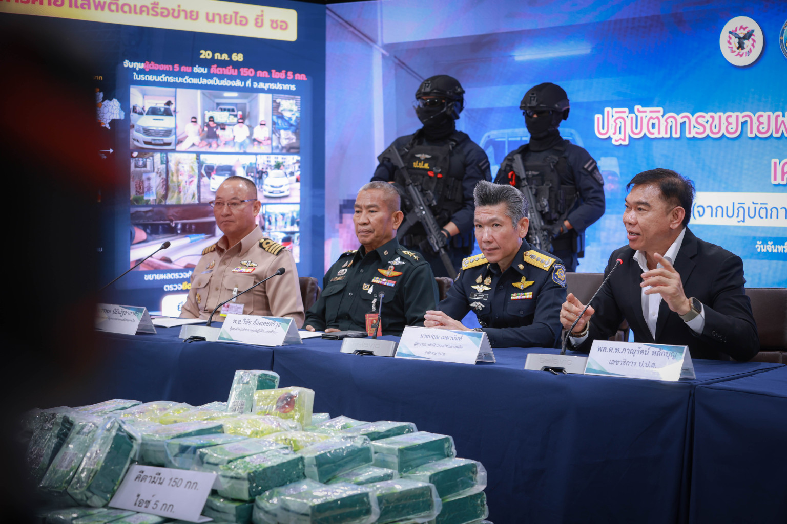 วันที่ 21 ก.ค.68 ที่ ป.ป.ส.พลตำรวจโทภาณุรัตน์ หลักบุญ พร้อมด้วย นายปฤณ เมฆานันท์ ผู้อำนวยการสำนักปราบปรามยาเสพติด สำนักงาน ป.ป.ส. พ.อ.พิรุฬห์สิระ เอี่ยมมาลา ผู้บังคับหน่วยข่าวกรองทางทหาร สนับสนุนหน่วยบัญชาการสงครามพิเศษ น.อ.บรรพต นิธิณัฐอาภาศิริ รองผู้บัญชาการหน่วยบัญชาการสงครามพิเศษทางเรือ น.อ.วิสูตร งิ้วแหลม รองผู้บังคับทหารอากาศดอนเมืองและ พันเอก วิชัย ก้องเดชตรีวุธ ผู้แทนหัวหน้าฝ่ายข่าวศูนย์ปฏิบัติการกองทัพบก แถลงผลการจับกุมผู้ต้องหา 5 คน คีตามีน 150 กก. ไอซ์ 5 กก. เหตุเกิดที่ โกดังเก็บพักยาเสพติดในพื้นที่ จ.สมุทรปราการ ขยายผลตรวจค้นบ้านพักผู้ต้องหารวม 5 จุด (จ.สมุทรปราการ, จ.พะเยา) ตรวจยึดอายัดทรัพย์สิน อาทิเช่น รถยนต์ 5 คัน รถจักรยานยนต์ 2 คัน สร้อยคอทองคำ เงินในบัญชีธนาคาร และเงินสด รวมมูลค่าประมาณ 3,350,000 บาท