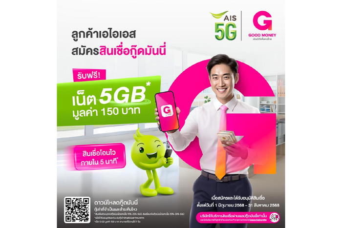 AIS One-2-Call! 5G ร่วมกับ Good Money by GSB แพลตฟอร์มสินเชื่อดิจิทัลในเครือธนาคารออมสิน ให้บริการสินเชื่อถูกกฎหมายภายใต้การกำกับดูแลของธนาคารแห่งประเทศไทย มุ่งบรรเทาภาระค่าใช้จ่ายในชีวิตประจำวันของคนไทย ด้วยการสนับสนุนการเข้าถึงบริการกู้สินเชื่อแบบถูกกฎหมาย ในอัตราดอกเบี้ยที่ต่ำ เพื่อช่วยเกื้อหนุนภาวะทางด้านการเงินของผู้บริโภคทุกกลุ่มอาชีพ พร้อมมอบสิทธิพิเศษอีกขั้นให้กับลูกค้า AIS ระบบเติมเงินที่ผ่านการอนุมัติวงเงินสินเชื่อจาก Good Money รับโบนัส ฟรี! อินเทอร์เน็ต 5GB ใช้งานได้ 7 วัน ตั้งแต่วันนี้ - 31 สิงหาคม 2568