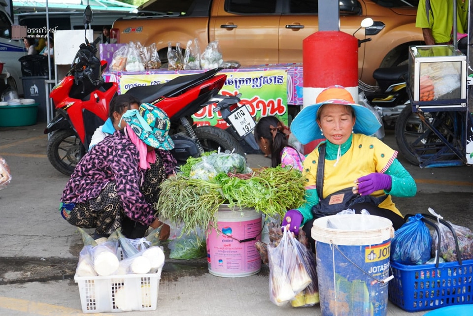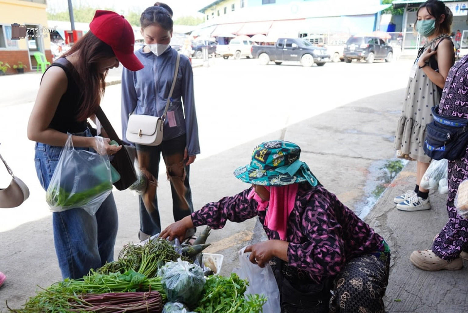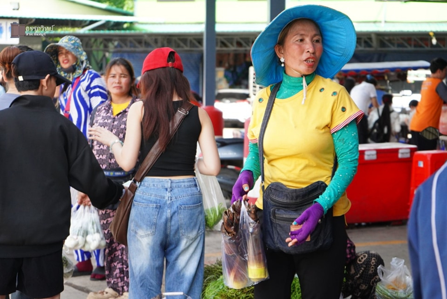 ขณะที่แม่ค้าขายผักและอาหารพื้นถิ่นชาวกัมพูชา ออกเดินขายของ และวางผักพื้นถิ่น รอขายสินค้าให้กับแรงงานชาวกัมพูชา ตามมาตร 64 และแรงงานชาวลาว ที่มาติดต่อทำเอกสารเรื่องการต่ออายุใบอนุญาตทำงานของแรงงานต่างด้าวตามระบบ MOU ที่ จุดผ่านแดนถาวรบ้านแหลม