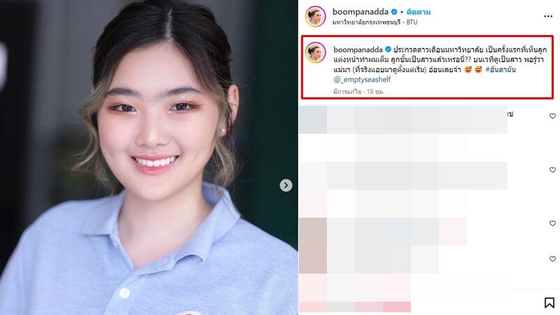 งานนี้แม่บุ๋ม เก็บภาพความสวยของลูกสาวในแบบที่ตัวเองเพิ่งเคยเห็นเป็นครั้งแรกมาฝาก พร้อมแคปชั่นว่า “ประกวดดาวเดือนมหาวิทยาลัย เป็นครั้งแรกที่เห็นลูกแต่งหน้าทำผมเต็ม ลูกชั้นเป็นสาวแล้วเหรอนี่?? บนเวทีดูเป็นสาว พอรู้ว่าแม่มา (ที่จริงแอบมาดูตั้งแต่เริ่ม) อ้อนเลยจ้า”