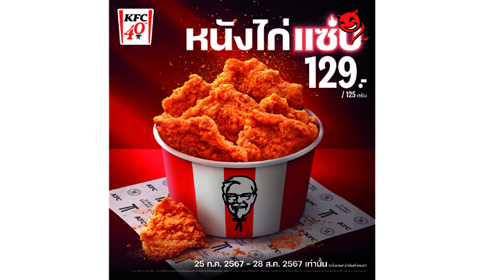 ที่เป็นเอกลักษณ์ของแบรนด์ในประเทศไทย มาเป็นส่วนสำคัญในการเฉลิมฉลองวันเกิดของเรา งานนี้เราจึงขนเอาหลากหลายเมนูแซ่บมาให้แฟนๆ ได้ฟินกันทั่วประเทศ และที่พลาดไม่ได้เลยก็คือ การกลับมาของ ‘หนังไก่แซ่บ KFC’ ที่ทุกคนเรียกร้อง แต่ครั้งนี้ของมีจำนวนจำกัดเฉพาะสาขาที่ร่วมรายการ แฟนๆ คงต้องรีบกันหน่อย”