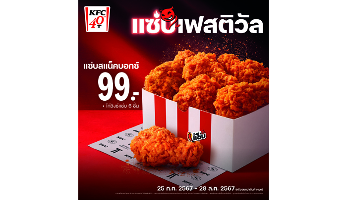 อาหารไทยใครๆ ก็รู้ว่าจุดเด่นคือรสชาติสุดเผ็ดร้อนและจัดจ้าน และถึงแม้ว่า KFC จะเป็นแบรนด์ต่างชาติ แต่ตลอด 40ปีที่อยู่กับคนไทยมา ทำให้ผู้พันแซนเดอร์สรู้ดีว่ารสชาติแบบไหน คือเทสต์ที่คนไทยชอบ จนเกิดเป็นเมนูซิกเนเจอร์ในตำนานอย่าง ‘วิงซ์แซ่บ’ ไก่ทอดโรยด้วยผงแซ่บออริจินัล เป็นที่ขายดิบขายดีตลอดกาล จนเป็นเมนูคู่ร้าน KFC ทั่วประเทศ ที่ไม่ว่าจะคนไทยหรือต่างชาติก็ต้องยกนิ้วให้กับความแซ่บจัดจ้านแบบออริจินัลนี้ เพื่อฉลองครบรอบ 40ปีของ KFC ประเทศไทยพร้อมไก่ทอดที่คนไทยรัก ลุงผู้พันขอเอาใจแฟนๆ สายแซ่บ จัดเต็มกับเทศกาล ‘Zabb Festival – แซ่บเฟสติวัล’ ที่มีไฮไลท์เด็ดอยู่ที่การกลับมาของ ‘หนังไก่แซ่บ KFC’ที่นำของทานเล่นยอดฮิตของคนไทยมาคลุกเคล้ากับผงแซ่บออริจินัลสุดจัดจ้านตามสไตล์ผู้พัน ที่เคยสร้างปรากฏการณ์โซเชียลแตกตั้งแต่วันเปิดตัวมาแล้ว แต่ครั้งนี้แค่เมนูเดียวยังไม่พอ KFC จัดมาให้อีก 2 เมนูแซ่บที่มาใหม่สุดพิเศษ การันตีได้เลยว่ารอบนี้เด็ดจนใครได้ลองก็หยุดแซ่บไม่ได้!