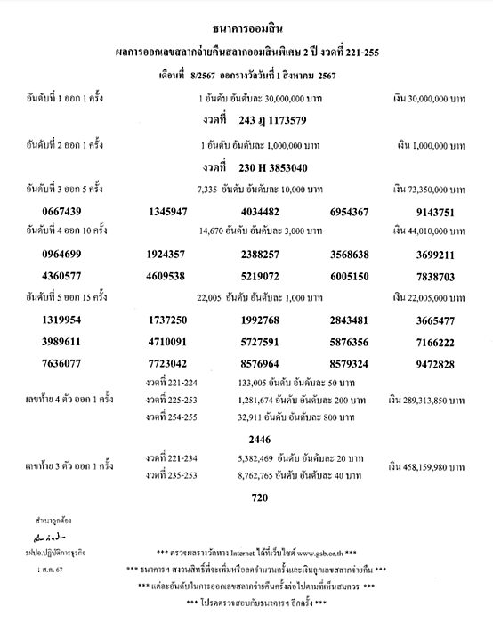 ตรวจหวย ตรวจสลาก ผลสลากออมสิน เลขสลากจ่ายคืนสลากออมสินพิเศษ 2 ปี งวดที่ 221-255 เดือนที่ 8/2567 ออกรางวัลที่ 1 สิงหาคม 2567