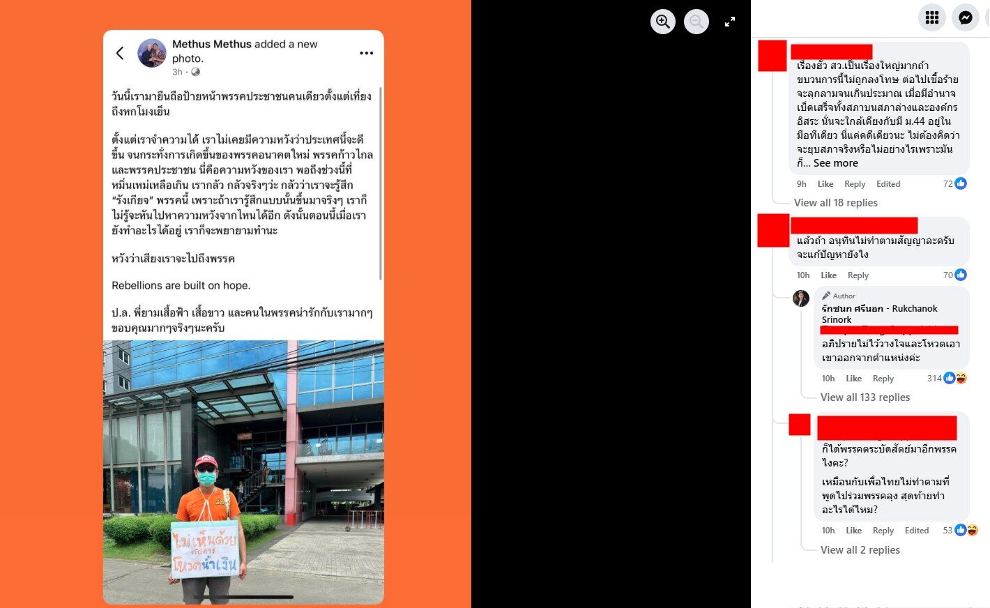 วันที่ 5 ก.ย.2568 น.ส.รักชนก ศรีนอก สส.กรุงเทพ พรรคประชาชน โพสต์ข้อความผ่านทางเฟซบุ๊ก รักชนก ศรีนอก - Rukchanok Srinork หลังมีผู้สนับสนุนไปยืนอยู่หน้าพรรค ความว่า ขอบคุณคุณ Methus มากนะคะ ที่แวะมาที่พรรค ถ้าวันนี้พวกเรา สส. พรรคประชาชนอยู่แถวนั้น คงได้แวะไปเจอกัน ไอซ์รู้ ว่าถ้าไม่รักไม่ห่วงไม่หวังในพวกเราจริงๆคงไม่ทำแบบนี้
