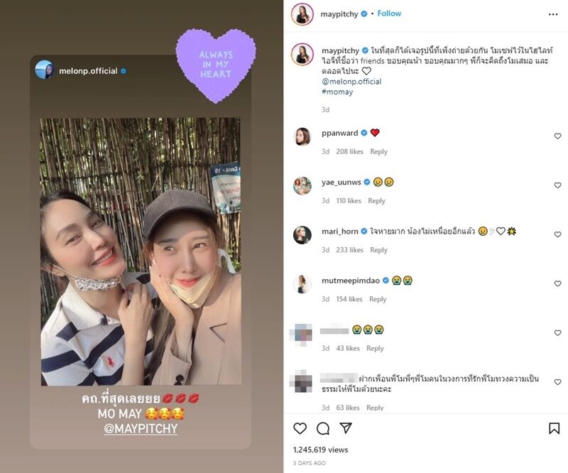 เมย์ เล่าว่าวันนั้นที่แตงโมมาทักมาขอเซลฟี่ถ่ายรูปด้วยกันยังขอให้ส่งรูปมาให้ เรายังไม่ได้รูปนั้น เสียใจ เราโพสต์อาลัยถึงเรื่องนี้ มีคนทักมาบอกว่าเขาใส่รูปเราไว้ในไฮไลต์ไอจีสตอรี่ เข้าไปดูอยู่ในกลุ่มเฟรนด์ดีใจมากน้องเขาคิดถึงเราเห็นเราเป็นเพื่อนจริงๆ ดีใจอย่างน้อยได้รูป เขาแท็กมาจริงๆ