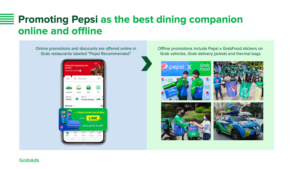 เป๊ปซี่ – ออกผลิตภัณฑ์ใหม่ “เป๊ปซี่ ไลม์” จึงต้องการโปรโมตในฐานะเครื่องดื่มคู่กับมื้ออาหาร โดยลงโฆษณากับแกร็บแบบครบลูป ทั้งโฆษณาแบนเนอร์ในแอปฯ ป้ายโฆษณาบนกล่องส่งอาหารของไรเดอร์ และแรปรอบคันรถแกร็บคาร์