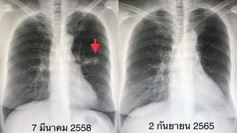 ระบุว่า "มะเร็งปอดเป็นมะเร็งที่พบบ่อย ถ้าพบเร็วในระยะแรก ระยะ 1-2 สามารถรักษาให้หายขาดได้ด้วยการผ่าตัด ผู้ป่วยหญิงอายุ 65 ปี เมื่อ 7 ปีก่อน ตรวจร่างกายประจำปี และเอกซเรย์ปอดทุกปี พบก้อนเล็ก ๆ ที่ปอดข้างซ้ายด้านบน ผ่านไป 1 ปีก้อนนี้โตขึ้น (ดูรูป) จึงมาปรึกษา"