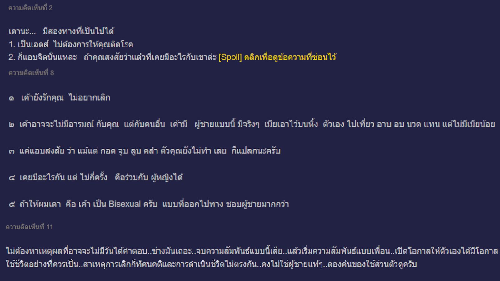 นอกจากนี้ บางคนก็มองว่า สามีเจ้าของกระทู้อาจเบี่ยงเบนทางเพศ หรือมีปัญหาด้านสุขภาพแต่บอกเจ้าของกระทู้ไม่ได้ หากอยากหย่าจริง ๆ ก็หย่าไป เพราะอายุเพิ่งสามสิบปลาย ๆ ยังมีโอกาสเริ่มต้นใหม่ได้อีก