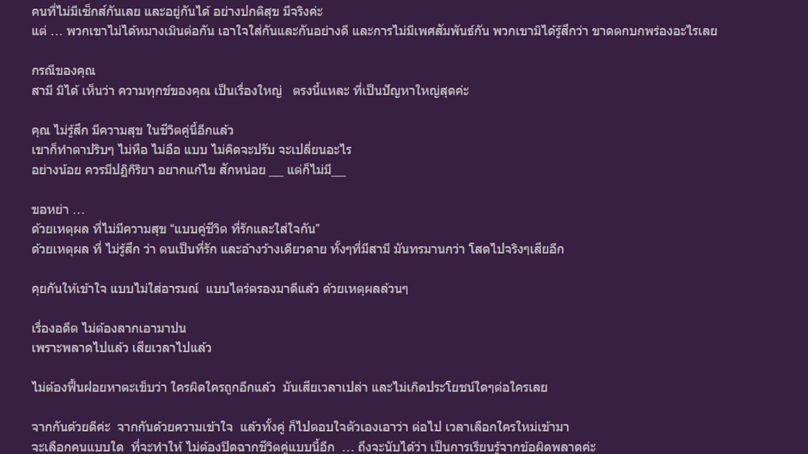 สาวตัดพ้อ แต่งงานมา 5 ปี สามีไม่เคยมีเซ็กซ์ด้วย บอกคนรักกันไม่จำเป็นต้องมีก็ได้ ตอนนี้มืดแปดด้าน อยากหย่า-อยากหนีไปอยู่คนเดียวมาก