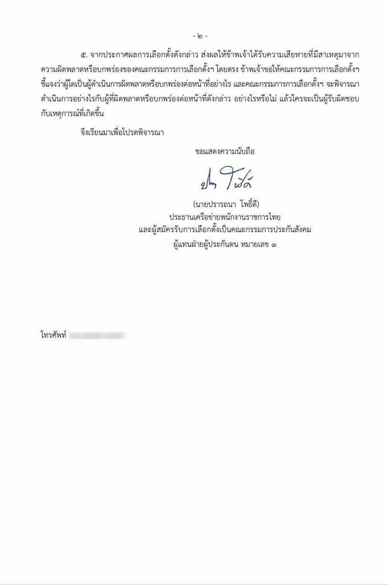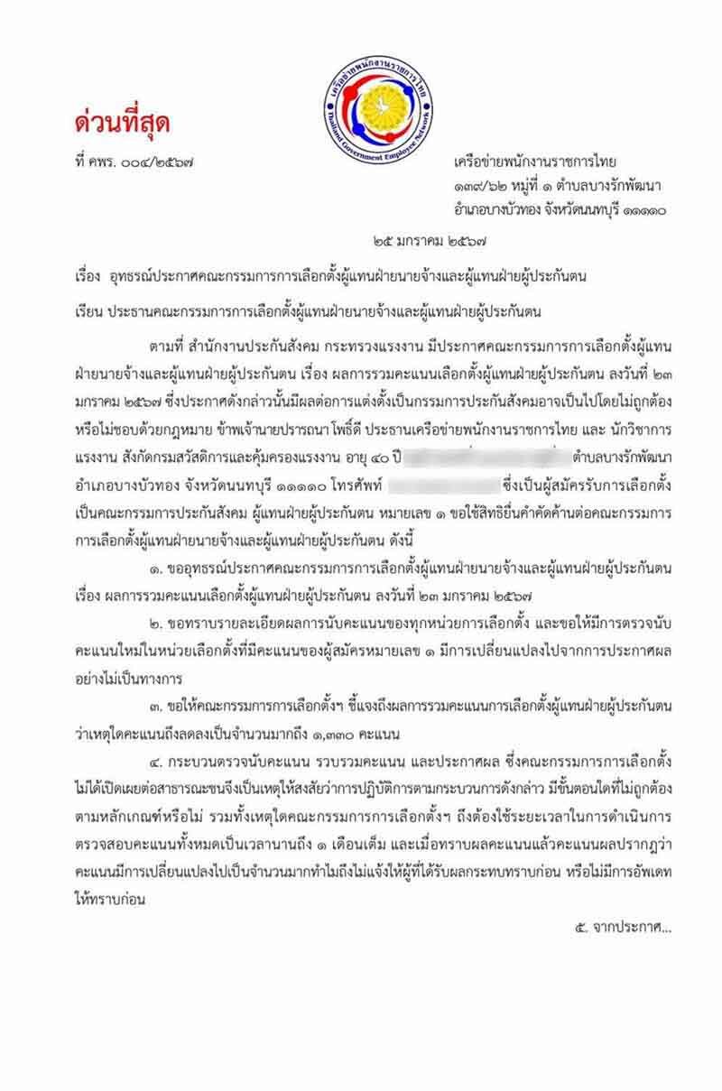 โดยขอทราบรายละเอียดผลการนับคะแนนของทุกหน่วยการเลือกตั้ง และขอให้มีการตรวจนับคะแนนใหม่ในหน่วยเลือกตั้งที่มีคะแนนของผู้สมัครหมายเลข 1 พร้อมขอให้คณะกรรมการการเลือกตั้ง ชี้แจงถึงผลการรวมคะแนนการเลือกตั้งผู้แทนฝ่ายผู้ประกันตนว่าเหตุใดคะแนนถึงลดลงเป็นจำนวนมากถึง 1,330 คะแนน
