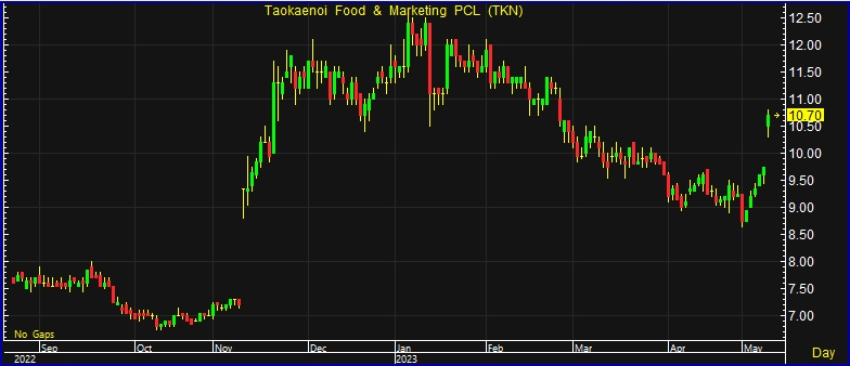 สำหรับราคาหุ้น TKN ปรับตัวขึ้นแรงตอบรับผลการดำเนินงานไตรมาส 1 สิ้นสุดวันที่ 31 มี.ค. 66 บริษัทฯมีกำไรสุทธิ 166.01 ล้านบาท เพิ่มขึ้น 164.40% เมื่อเทียบกับงวดเดียวของปีก่อนมีกำไรสุทธิ 62.79 ล้านบาท โดยบริษัทฯ มีรายได้จากการขายไตรมาส 1 จำนวน 1,243.7 ล้านบาท เพิ่มขึ้นร้อยละ 28.5 จากไตรมาสเดียวกันปีที่ผ่านมา และยังคงมีการปรับตัวที่เพิ่มขึ้นกว่าไตรมาส 4/65 เป็นผลมาจากทั้งในส่วนของตลาดในประเทศที่มีการเติบโตของยอดขายในทุกๆ ช่องทางไปพร้อมๆ กับการส่งเสริมการขายและการตลาด ซึ่งทำให้เกิดการขยายตัวของการอุปสงค์ในบริโภคสาหร่ายในประเทศอย่างต่อเนื่อง และการเติบโตของตลาดต่างประเทศทั้งจากการเติบโตในประเทศจีนที่มีการยุติมาตรการโควิดเป็นศูนย์ในประเทศ ทำให้มีการบริโภคและความต้องการสินค้าอุปโภคบริโภคเพิ่มขึ้น รวมถึงการเติบโตในอีกหลายๆ ประเทศ เช่น สหรัฐอเมริกา อินโดนีเซีย มาเลเซีย ที่มียอดขายเพิ่มขึ้นอย่างต่อเนื่องเช่นกัน