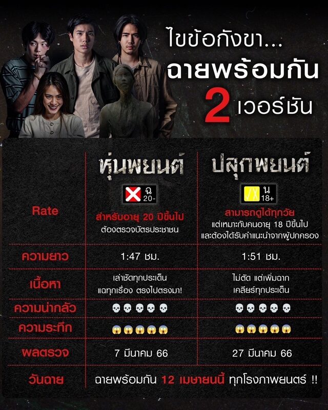 งบประมาณมากขึ้นไหม หนังมี 2 เวอร์ชั่น? “มันเหมือนเดิมครับ เพียงแต่เป็นเรื่องของการตัดต่อ เราต้องมาตัดใหม่ ทำเพลงใหม่ (เรื่องโรงฉายจะยังไง?) อันนี้ต้องถามบริษัท ว่าเขาจะวางยังไง เพราะเดือนเมษายนหนังไทยค่อนข้างเยอะ (มีแนวคิดที่จะขยับไปอีกไหมตอนแรก?) การวางโปรแกรมจะเป็นเรื่องของทางไฟว์สตาร์ ผมจะไม่ได้เข้าไปยุ่งอะไร อยู่ที่ความสะดวกของผู้ใหญ่ ที่อยากฉายตอนนี้เพราะด้วยเหตุผลอะไรของเขา”