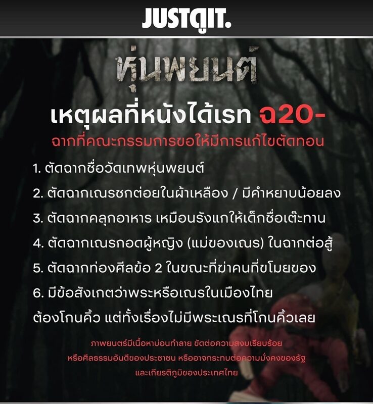 รสชาติจะเหมือนกันไหม ระหว่างเรต 18+ กับ 20- ? “ถ้าคนดูได้ดูเรต 20- คนดูจะได้กลับไปคิดว่ามันเกิดอะไรขึ้นกับวัดวัดนี้ แล้วทุกคนในวัดคิดยังไง ในเรื่องของศาสนา ทุกคนคิดยังไง แต่ในเรต 18+ เราขยายให้เขารู้เลยว่า เขารู้สึกยังไง ไม่ต้องคิดเยอะ แต่หนังคนดูจะได้อรรถรสต้องให้คนดูกลับไปคิดด้วย แต่นี่ก็เข้าใจ เขาลดเรตลงมาเพื่อให้เด็กได้เข้าไปดูได้ อาจจะต้องทำให้เด็กเข้าใจในหนังเลย”