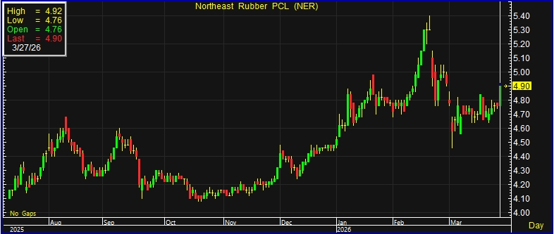 บริษัทหลักทรัพย์ พาย จำกัด แนะนำซื้อ NER ด้วยปัจจัยบวกจากผลประกอบการปี 2569 ยังเติบโตได้จากเป้าการขายที่ผู้บริหารคาดไว้ที่ระดับ 500,000 ตัน โดยมีตลาดที่คาดว่าจะขายเพิ่มได้อย่างประเทศอินเดีย ที่มีโอกาสเห็นการปรับโครงสร้างภาษีสินค้ากลุ่มยางผสม