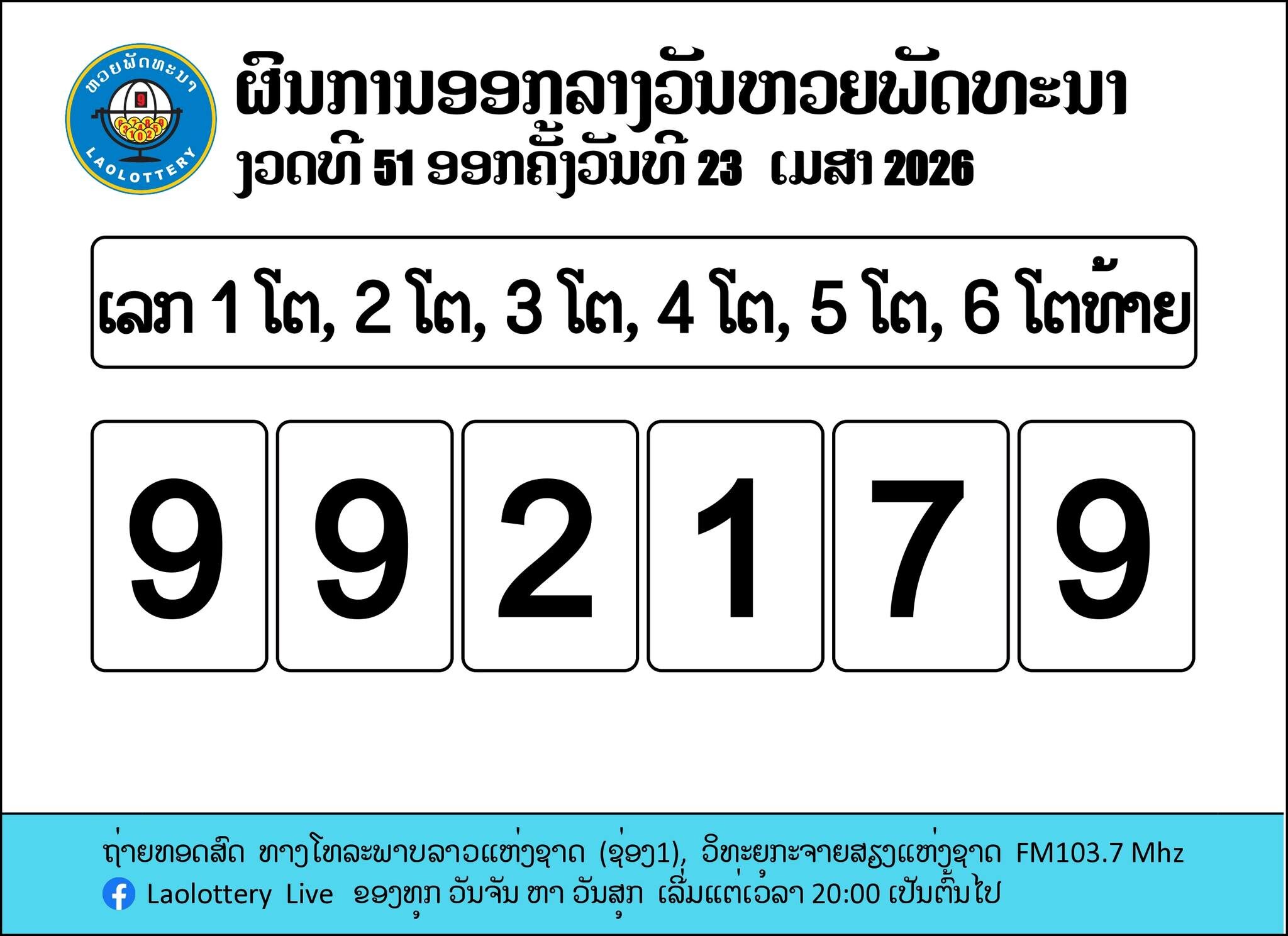 สรุปผลการออกรางวัลสลากกินแบ่งรัฐบาล สปป.ลาว หรือ หวยพัฒนา ภายใต้การกำกับของกระทรวงการเงิน งวดล่าสุดวันที่ 23 เมษายน 2569 ผลรางวัลทั้งหมดมีดังนี้