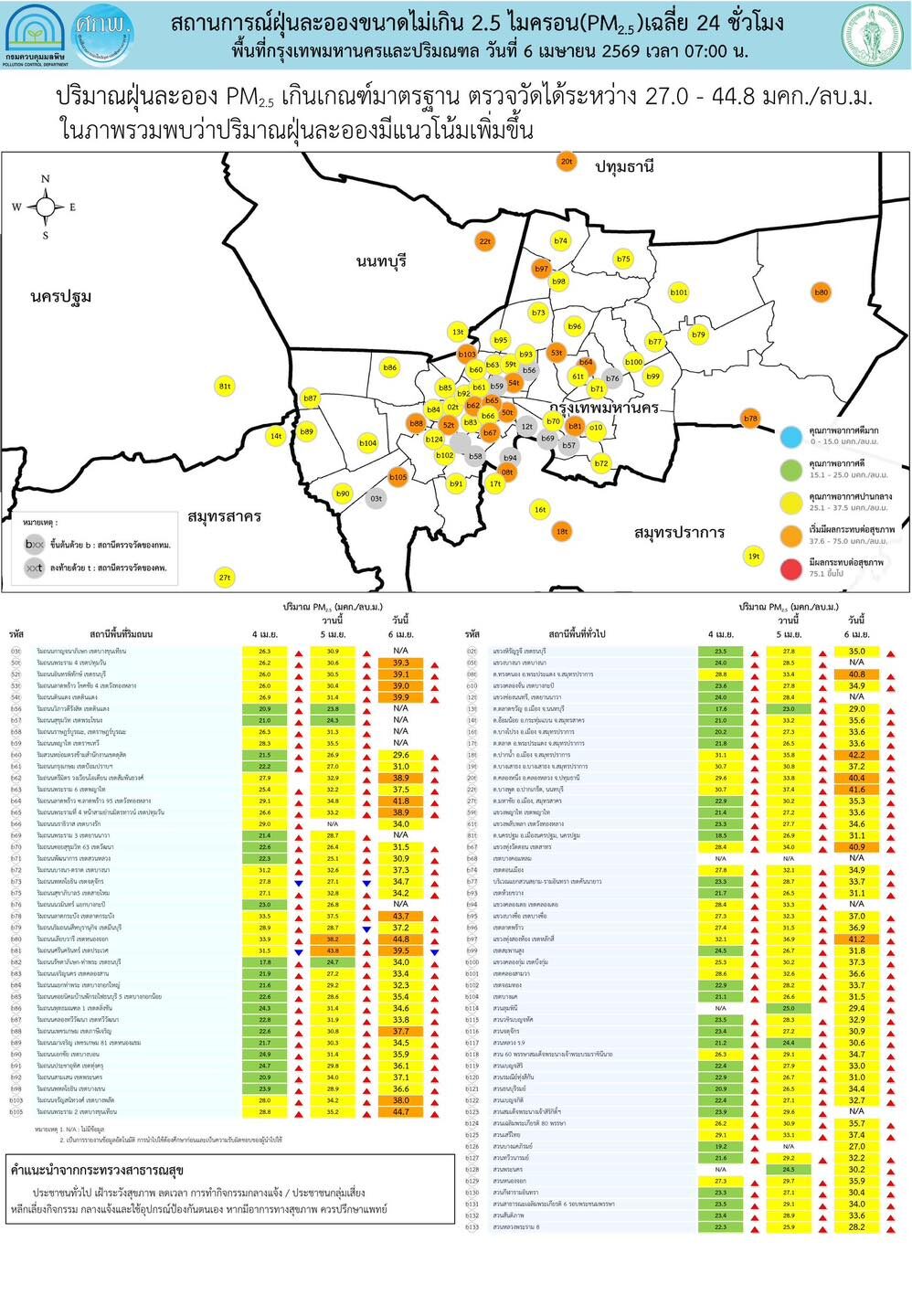 วันที่ 6 เม.ย.2569 ศูนย์สื่อสารการแก้ไขปัญหามลพิษทางอากาศ รายงานการติดตามตรวจสอบคุณภาพอากาศ ประจำวันที่ 6 เมษายน 2569 ณ 07:00 น สรุปดังนี้