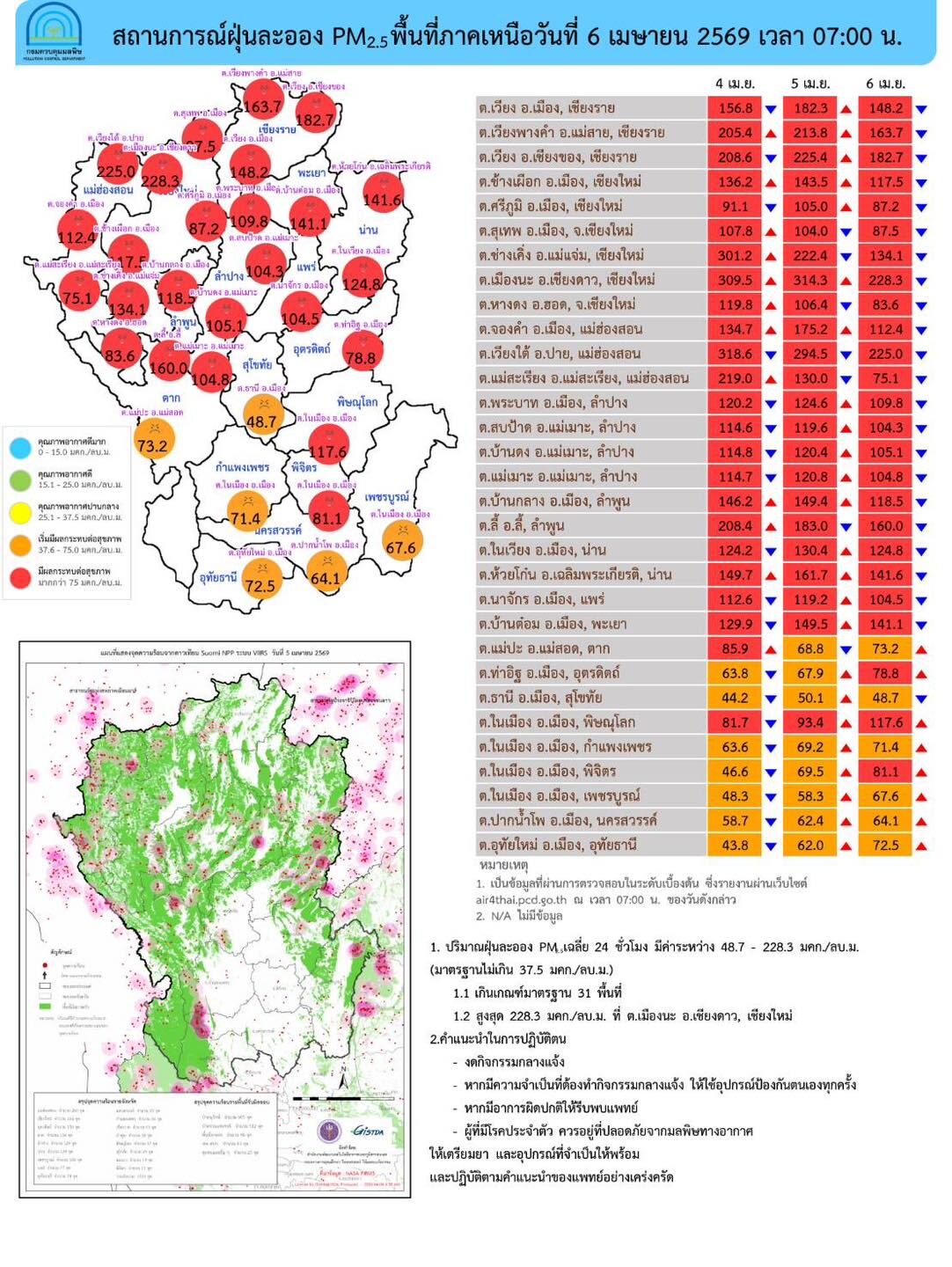- สำหรับประชาชนที่อยู่บริเวณพื้นที่มีผลกระทบต่อสุขภาพ (พื้นที่สีแดง) ควรหลีกเลี่ยงกิจกรรมกลางแจ้ง หรือใช้อุปกรณ์ป้องกันตนเอง หากมีอาการทางสุขภาพควรปรึกษาแพทย์