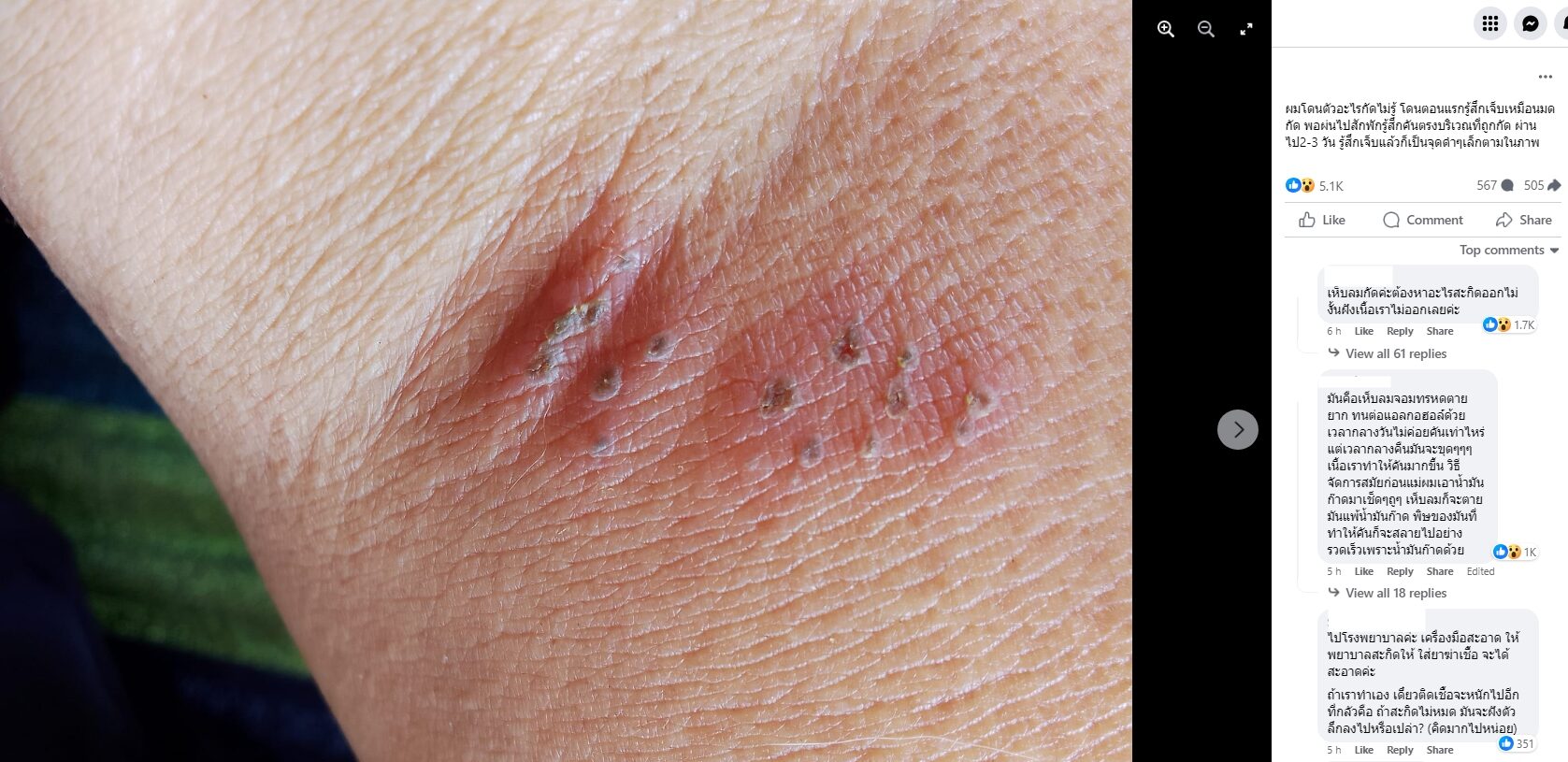 ผู้ใช้เฟซบุ๊กรายหนึ่ง โพสต์ข้อความในกลุ่มนี่ตัวอะไร ถามสมาชิกหลังโดนตัวอะไรไม่รู้กัด ความว่า ผมโดนตัวอะไรกัดไม่รู้ โดนตอนแรกรู้สึกเจ็บเหมือนมดกัด พอผ่านไปสักพักรู้สึกคันตรงบริเวณที่ถูกกัด ผ่านไป 2-3 วัน รู้สึกเจ็บแล้วก็เป็นจุดดำๆเล็กตามในภาพ