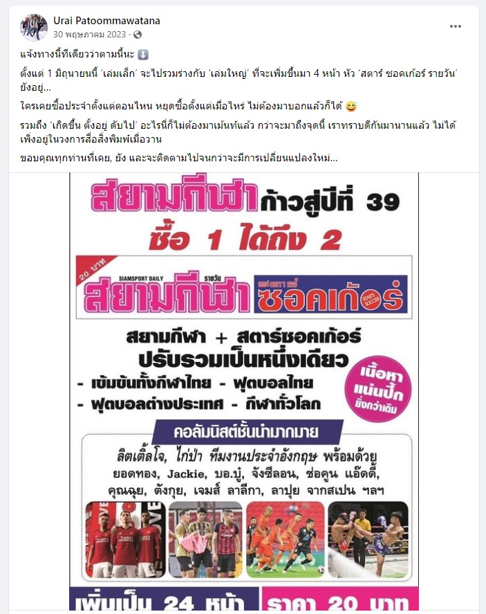 อ่านข่าวต้นฉบับได้ที่ : สตาร์ซอคเก้อร์รายวัน กลับสู่แผงหนังสืออีกครั้ง เริ่มวางแผง 1 ก.พ. 2567
