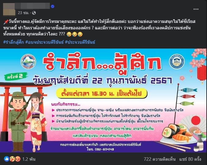 ผู้ใช้เฟซบุ๊กรายหนึ่ง ได้ออกมาโพสต์ขอความเป็นธรรม หลังจากไปร่วมการแข่งขันกินเร็วอาหารญี่ปุ่นที่จัดโดยหน่วยงานราชการจังหวัดประจวบคีรีขันธ์ เธอกินหมดเป็นคนแรกแต่ได้ที่ 2 เพราะลีลาสู้คนได้ที่ 1 ไม่ได้